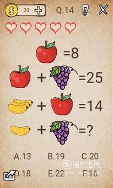 葡萄=17,香蕉=6,所以1个香蕉=2,在问号中的葡萄,明显比上面的葡萄缺少了些,所以答案最接近于18。