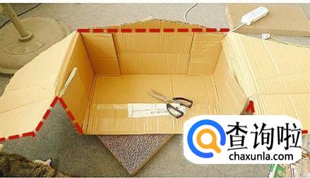 然后我们把上一步剪好的纸箱子,用透明胶或者胶水粘到一起,粘成如图所示的样子,这样猫窝的雏形就做好了。