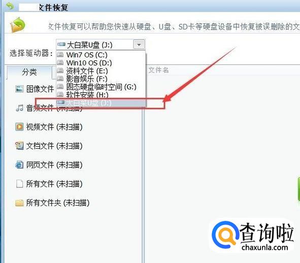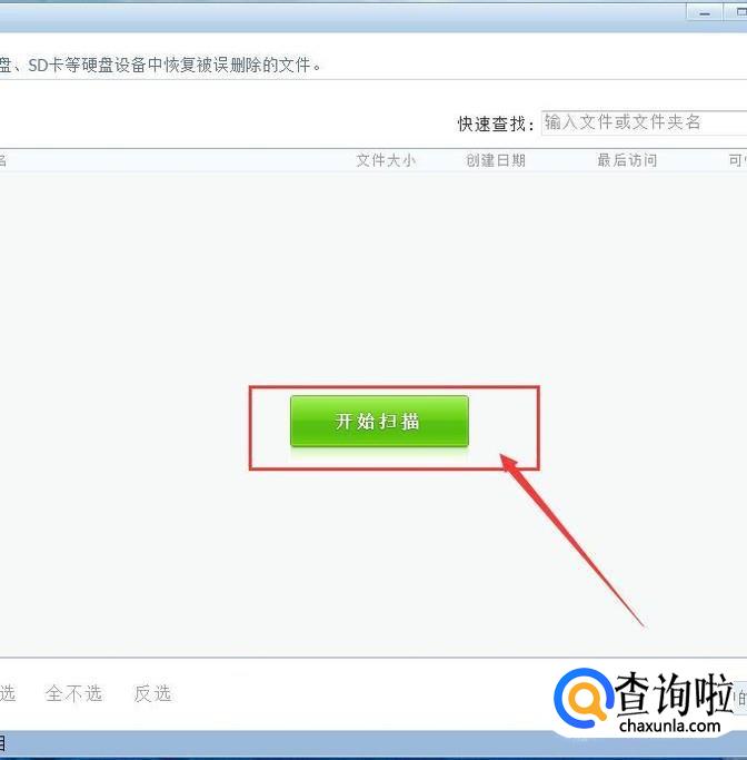 文件恢复功能安装完毕之后,选择要扫描的磁盘设备,并点击“开始扫描”按钮。