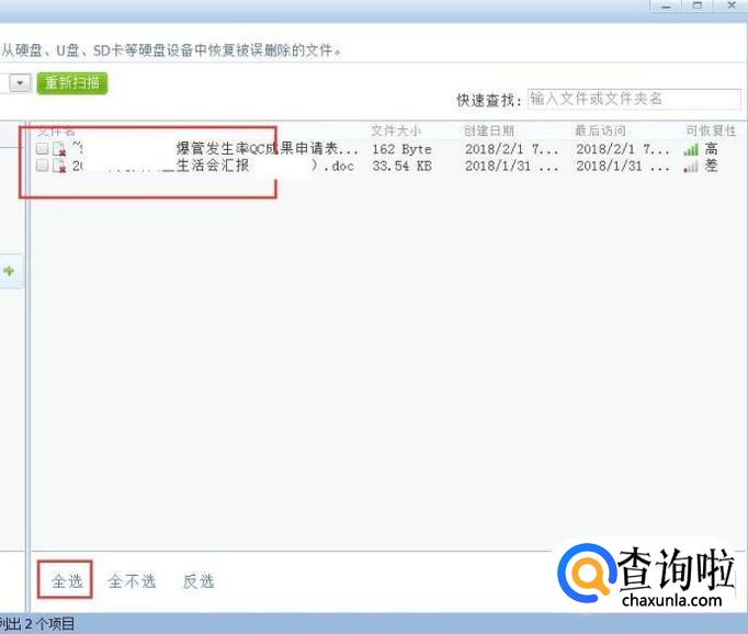 文件扫描完毕之后,会出现在待恢复的文件列表中,在该列表中,选择要恢复的文件,页面中会显示该文件恢复可能性的大小。