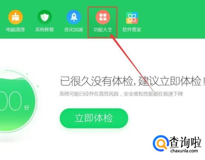 这里以安全类软件中内置的文件恢复功能为例向大家讲解,打开安全卫士软件,点击页面顶部的“功能大全”选项。