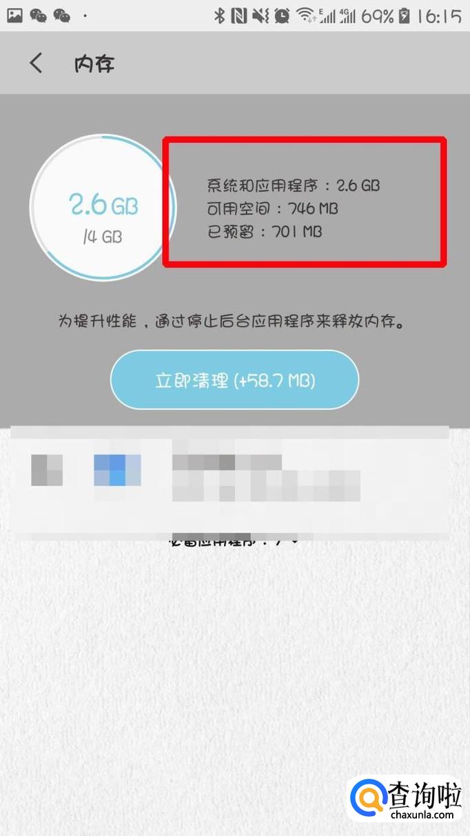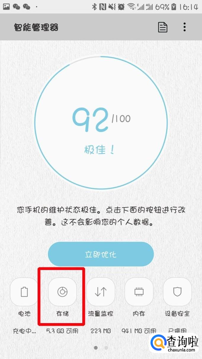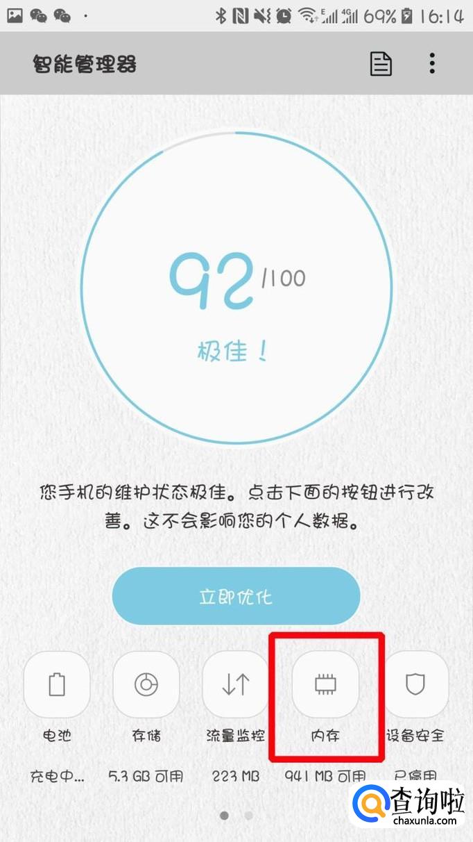 如果我们想查看手机运行内存还有多少,先返回到智能管理器页面,再点击内存