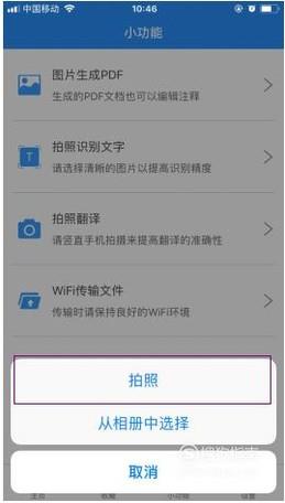 这里是新增的小功能,选择拍照识别文字中的拍照或者拍照翻译