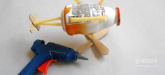 把尾翼和起落架都用热熔胶粘贴到酸奶瓶上。