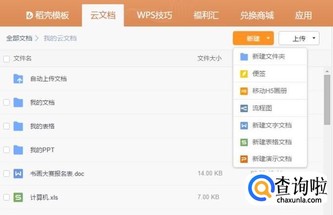 首先点击打开电脑/手机页面的WPS演示,点击中央的“云文档”,左击“新建”,建立一个新的PPT。
