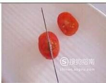 两另一段西红柿也按照这种方法切开,切成对称的两半。到现在,刀工的工作就已经完成了。