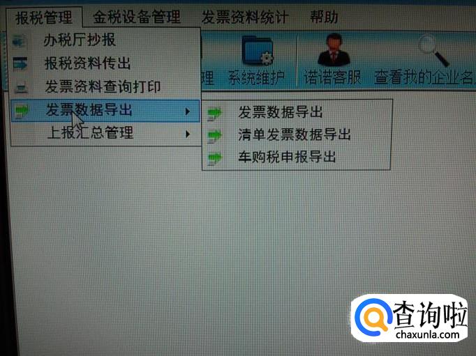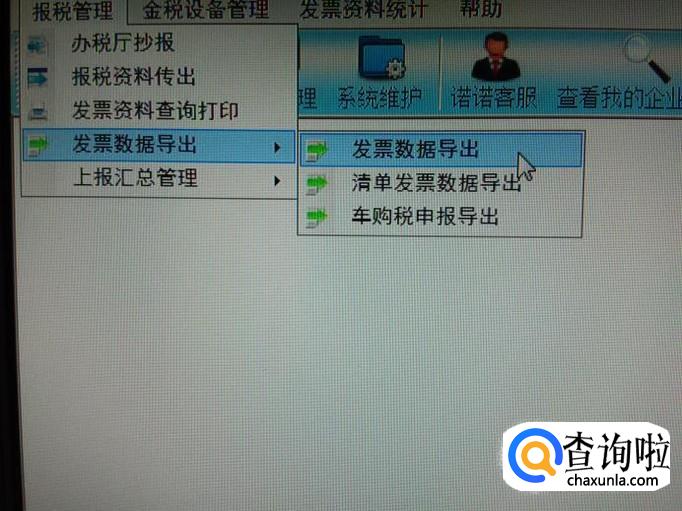点开开票系统后,点击左上方的报税管理,在下拉菜单中找到发票数据导出。