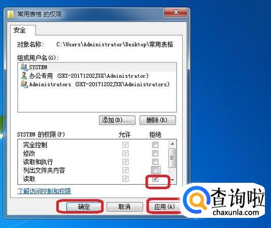 我以修改用户“system”为例,来演示修改权限,点击编辑后,出现“权限”面板,我们点击勾选拒绝“读取”,如图所示,点击应用、确定。