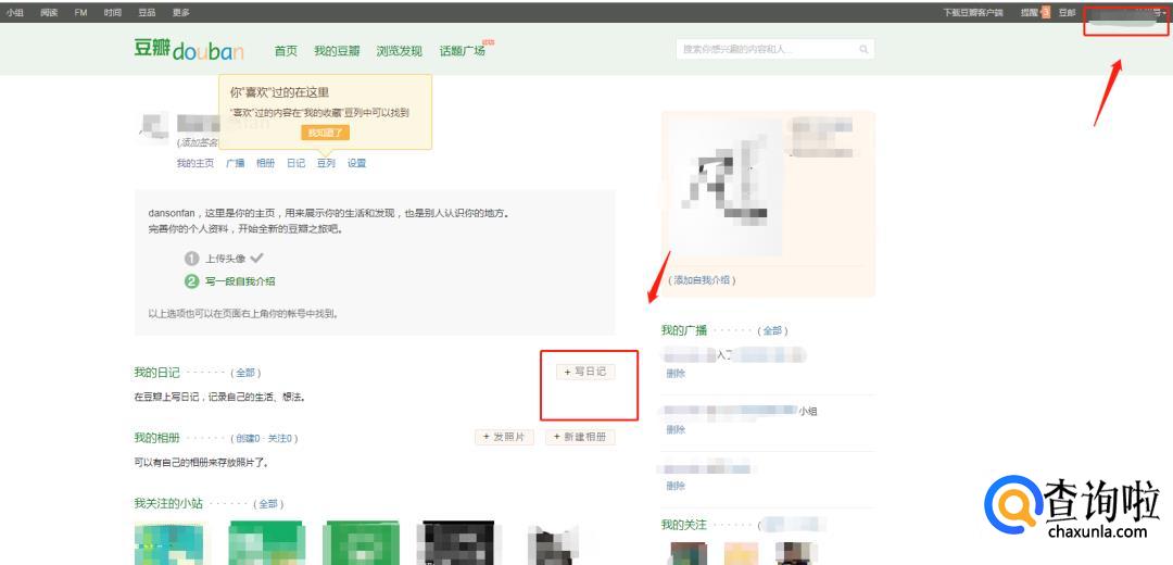 打开豆瓣链接(可以在微博、网站、论坛)发布此超链接,这里选用豆瓣链接,先登录自己的豆瓣账号,然后进入个人中心,在我的日记类目,点击【写日记】。