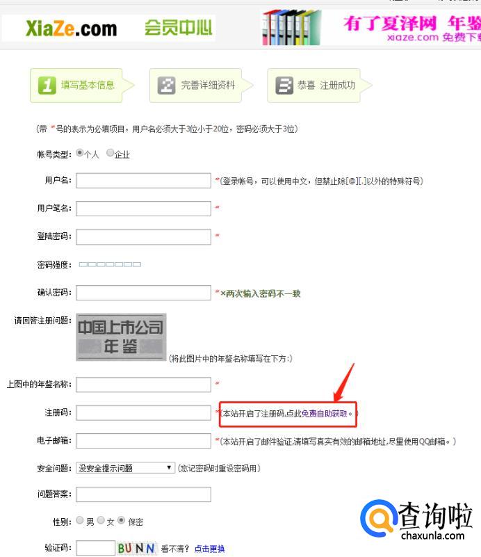 再次进入夏泽网,将会在搜索下方,看到“您所申请的注册码为:xxxxxx”,每个时间段生成的注册码都不同,复制此注册码,填入步骤6的注册码框内,再填上其他基本信息,即可完成账号注册,查看免费年鉴。