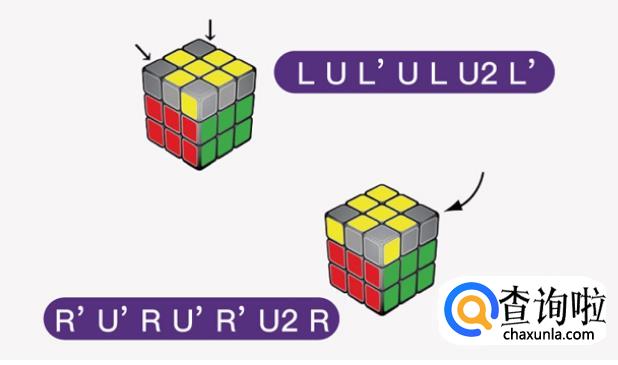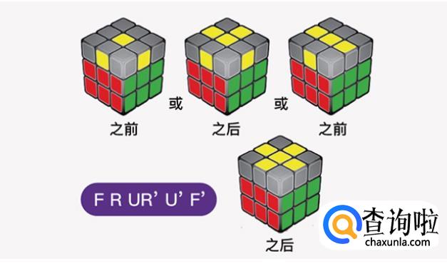 再将顶层(应该是黄色)边块调整向上,做出黄十字。若按照口诀转动1次之后,顶层没有出现黄色的十字,可按照口诀重复转动,直到黄色十字出现为止。