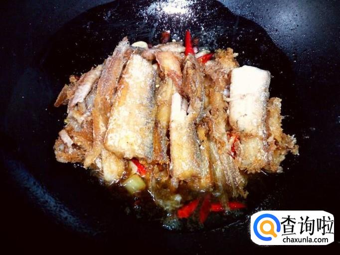 随即放入调和好的料汁,放入红干椒,烧开,然后放入煎塌好的刀鱼。