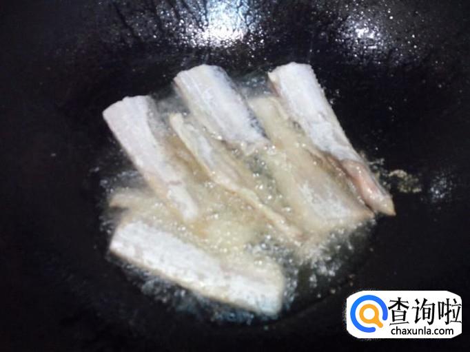 锅里放入油加热,油热后放入刀鱼小火煎塌,煎塌至表面焦黄,盛出备用。