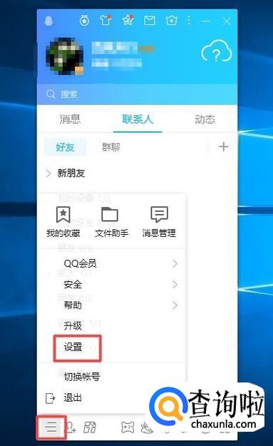 首先,我们用电脑登录我们的QQ,然后我们点击图示中的那个按钮,弹出的界面,我们点击设置;