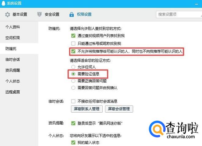 然后我们将不允许将我们推荐给可能认识的人,同时也不像我推荐可能认识的人给勾选上,然后我们还需要勾选上需要验证信息。这样我们就设置好了。