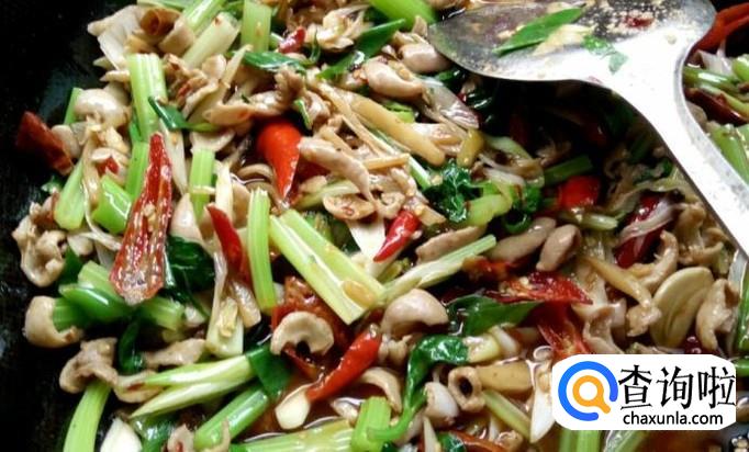 开大火把锅烧热,加入适量的食用油,油热后倒入花椒、姜、蒜和红辣椒等调料,炒香后加入豆瓣,再倒入肥肠用大火炒制,肥肠炒卷后加入芹菜和少量盐,翻炒几下!