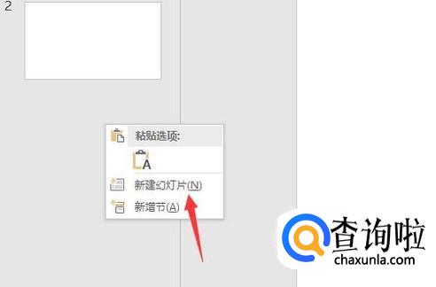 在幻灯片小窗口预览旁边的空白处,点击鼠标右键,这时候就能看到一个新建幻灯片的方法,直接点击即可新建成功。