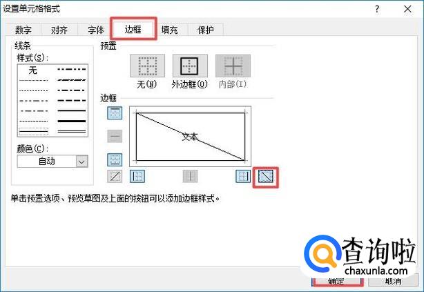 弹出的界面,我们点击边框,然后我们点击斜线,之后我们点击确定;