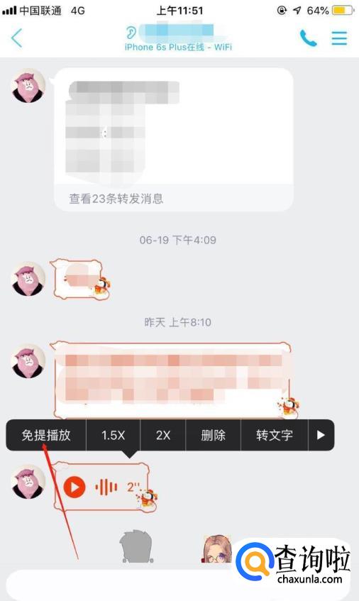 我们长按语音,会出现下图中的选项,点击第一个选项“免提播放”。