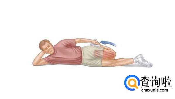 第二个动作也可以采取侧躺的方式进行。同样可以达到拉伸的效果,且不容易发生歪道的现象。
