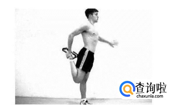 还可以左脚着地,右小腿后弯折,右手拉住脚掌,保持半分钟,然后换腿进行。