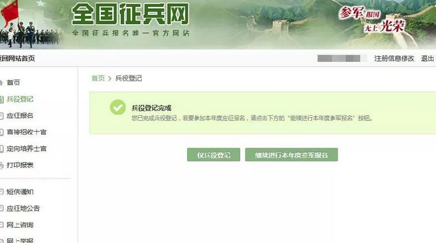 登录进入全国征兵网后,点击进入左侧的“兵役登记已完成”栏目内。拉到最底部是下图这样的,然后把选择应征地里面的信息修改的所在的大学,再修改参军意愿,然后点击“确定”就可以了。