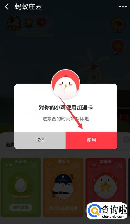 然后下面会弹出选项框,此时会显示我们所获得的道具,其中就包含了加速卡,如果有些同学没有获得加速卡的话,那么要先获得了才可以使用。此刻我们单击加速卡下方的“使用道具”按钮。