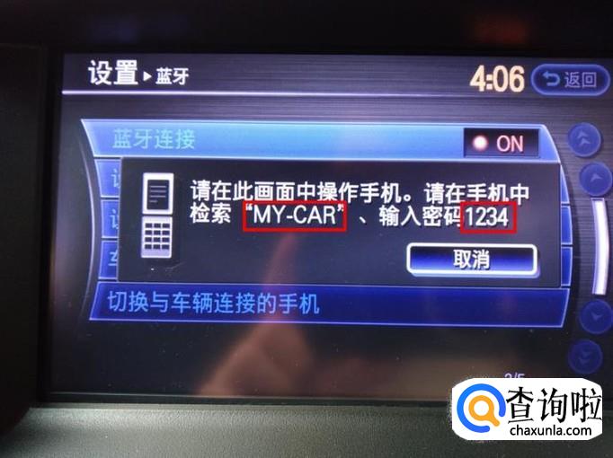 打开要连接的手机蓝牙,按照页面提示,在手机蓝牙设备列表中找到“MY-CAR”进行配对,密码输入1234;