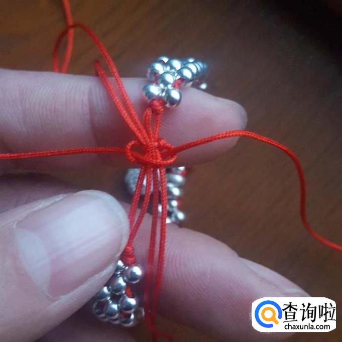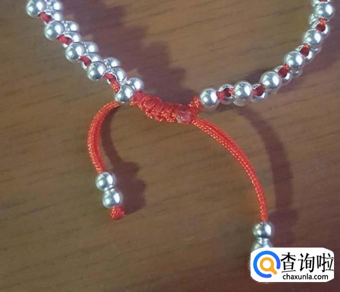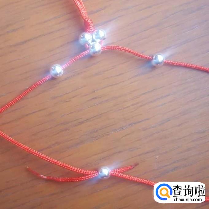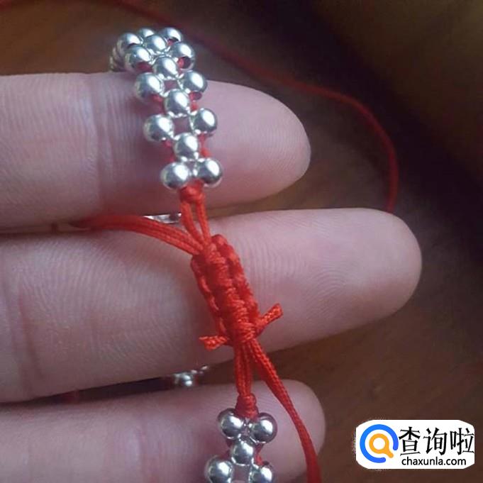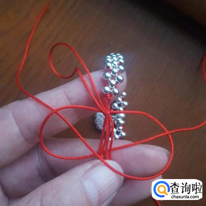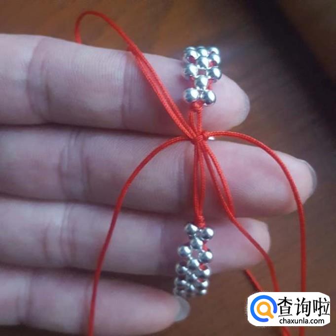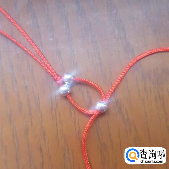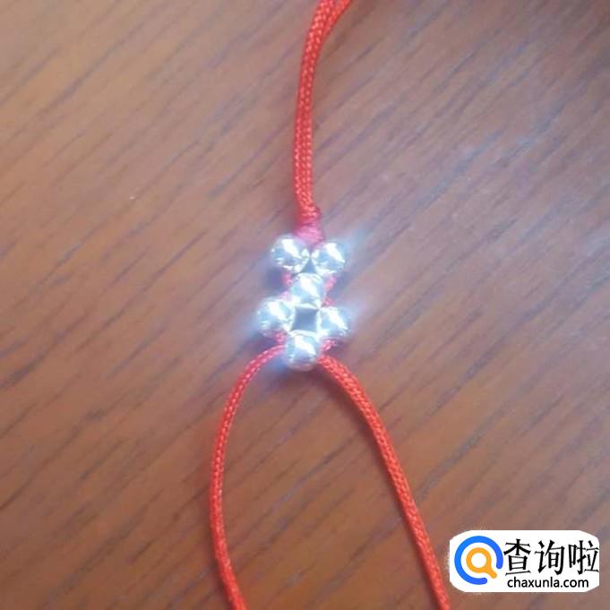 红线对半折后,在没开口的一端打个结,线头不要留太短了,后面还要进行加工的,打好结后,先一边线穿一棵银珠,再穿一棵珠子,两边对穿拉紧就可以了