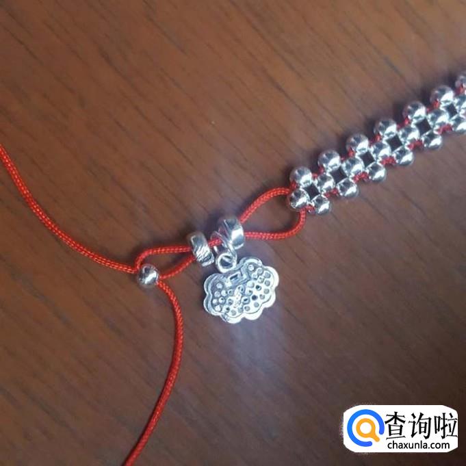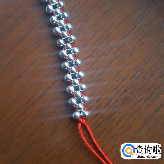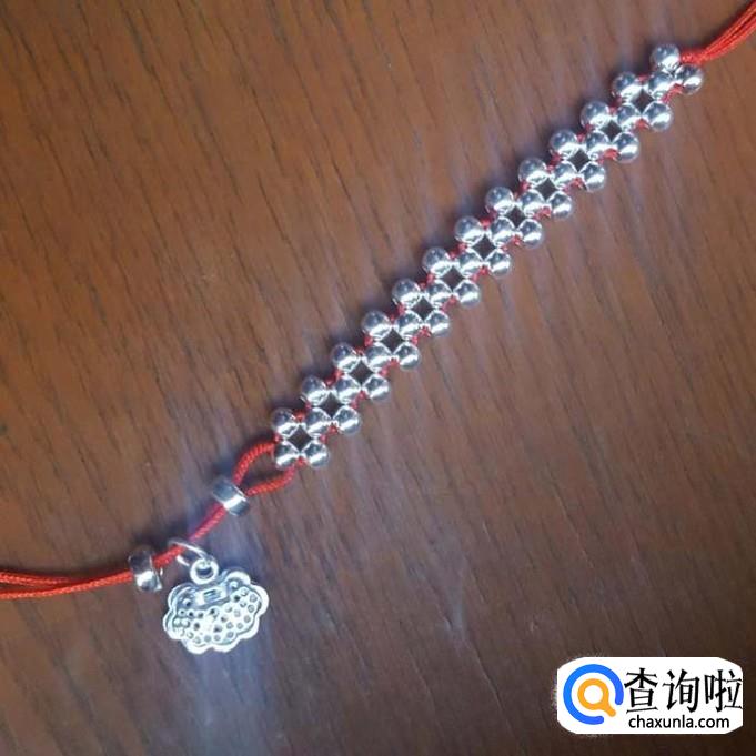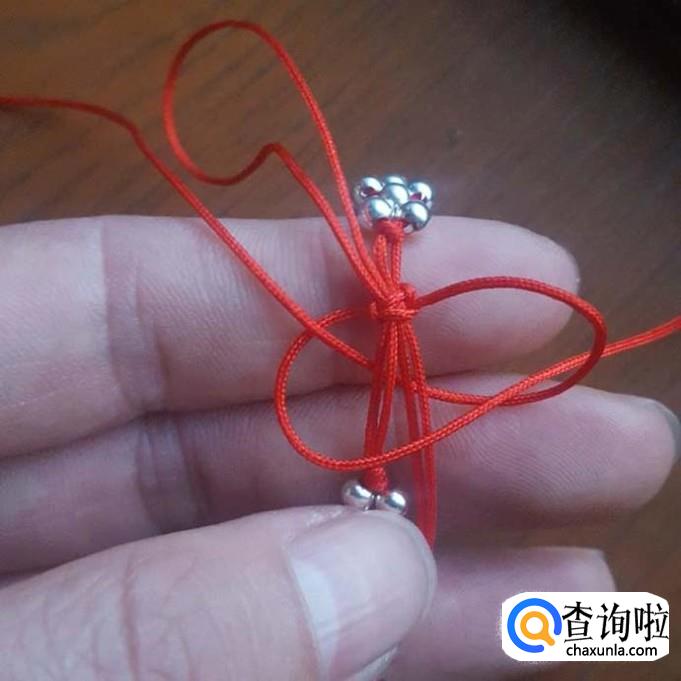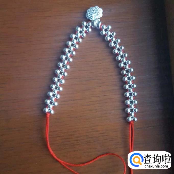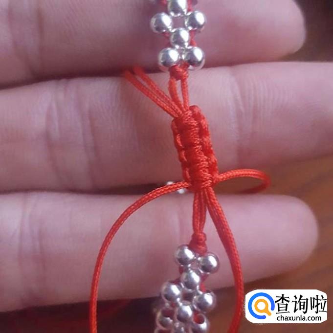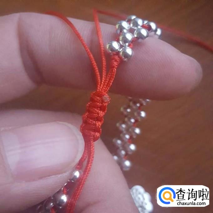 红线对半折后,在没开口的一端打个结,线头不要留太短了,后面还要进行加工的,打好结后,先一边线穿一棵银珠,再穿一棵珠子,两边对穿拉紧就可以了