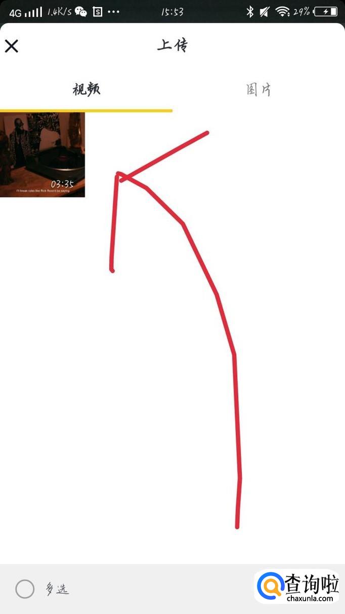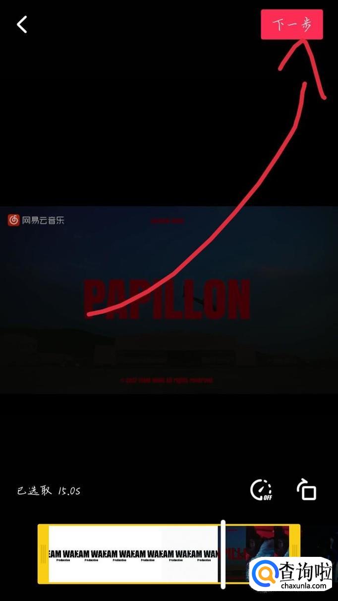 选中你要发的长视频,如图1箭头所示。这样你就可以上传你要上传的抖音的长视频了。你会看到出现一个新的界面,这个是在剪辑你的视频,点击“下一步”选项,如图2箭头所示。