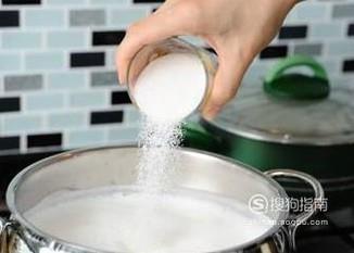 将牛奶倒入锅中,加入适量的白糖,然后煮开。