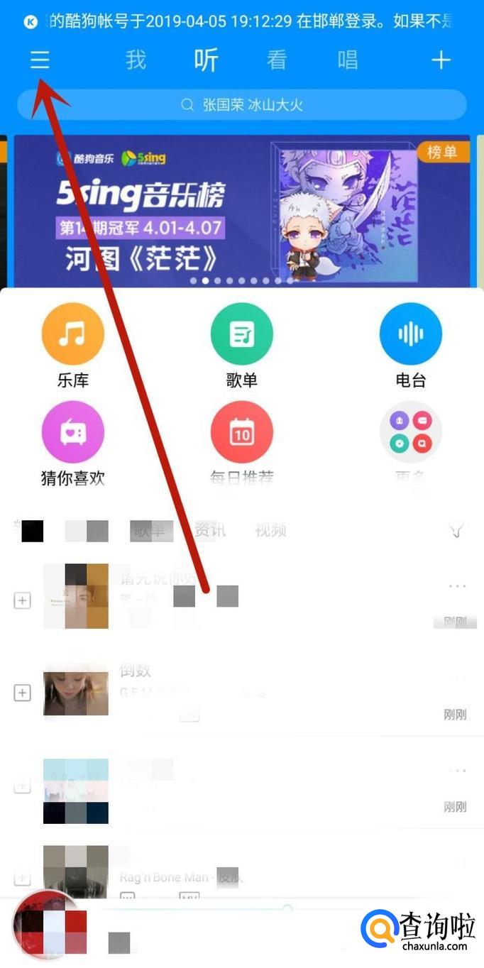 将耳机插到手机上面,进入酷狗音乐,点击图示位置的三道横杠。