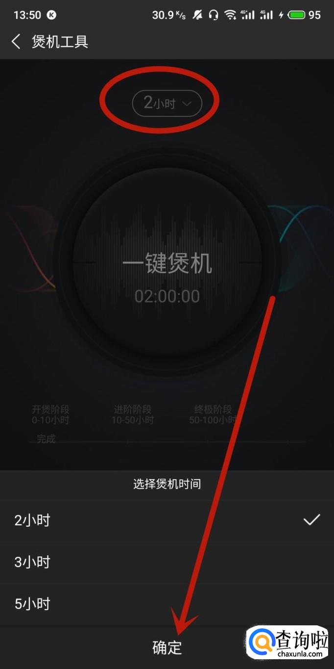 进入之后,点击图示位置打开煲机时间选择页面,选择好煲机时长,点击确定,如图所示。