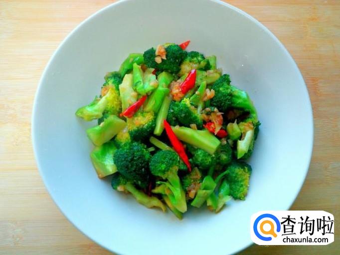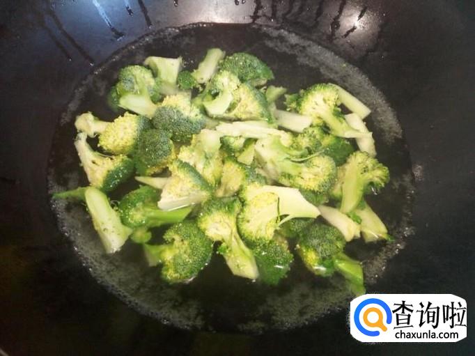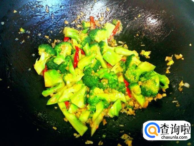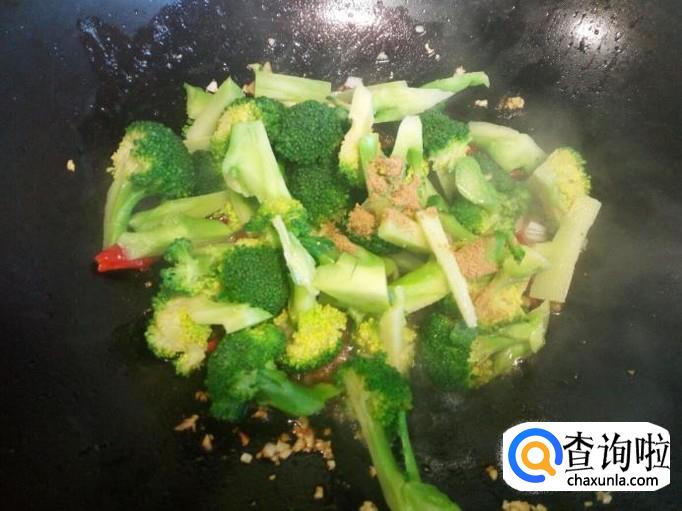 炒至西兰花断生,放入少许味精,关火出勺。