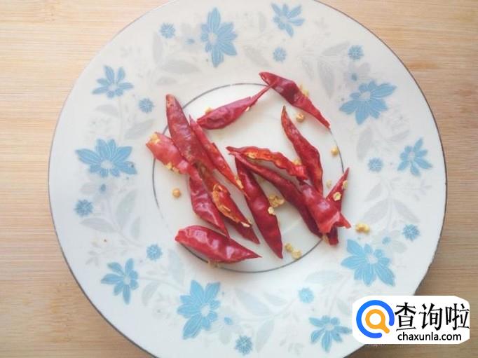 红干椒用水清洗干净,控干水分,斜刀切成段。切好葱,姜备用。