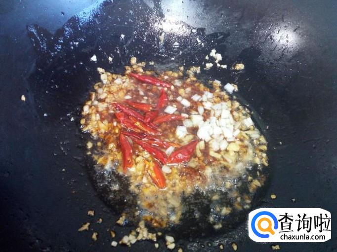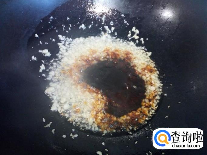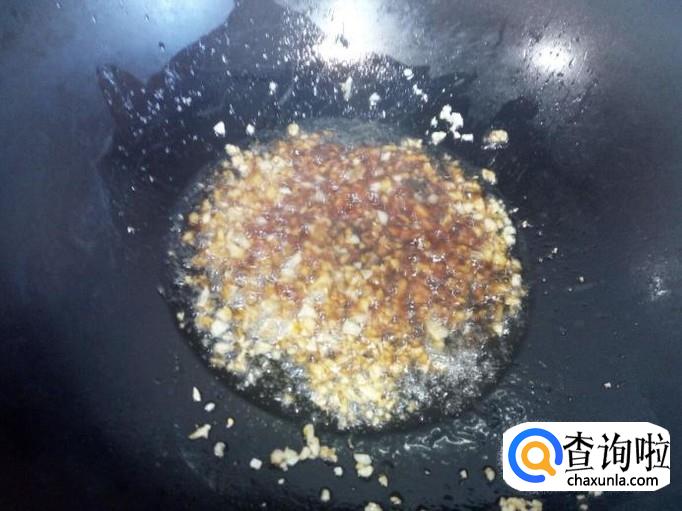 锅里放入油加热,油热后放入蒜末小火翻炒。炒出蒜香味后,放入料酒,两匙儿蚝油,翻炒成蒜蓉。