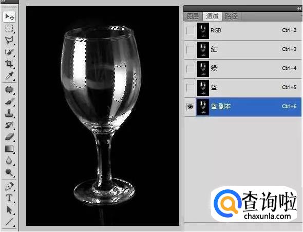 Ctrl+单击复制的“蓝 副本”通道,载入透明的玻璃部分选区。