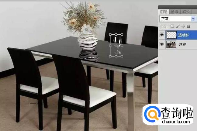 打开餐桌场景素材图片,用移动工具将“透明杯”图层拖移到刚打开的图片上。