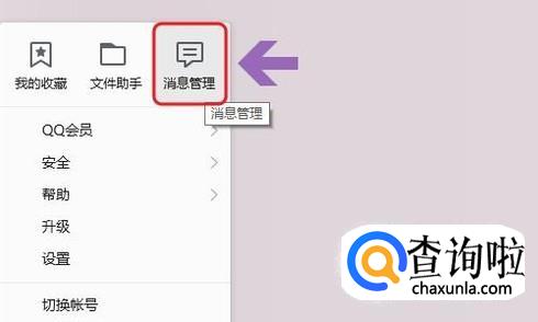 打开QQ面板之后我们点击左下角的主菜单图标,也就是三条线的那个地方,如图一;然后在弹出的窗口右上角我们会看到“消息管理”选项;