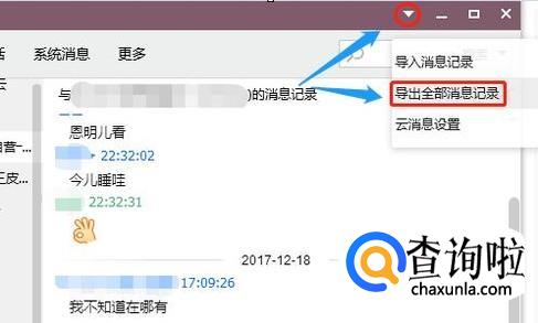 接着在聊天记录窗口的右上角我们点击一个小的三角形按钮,接着就会弹出“导出全部消息记录”选项了,目前系统支持三种格式的文件导出,见图二;