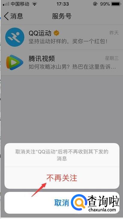 最后系统会提示你取消后将不会接收此服务号消息,点击取消即可。