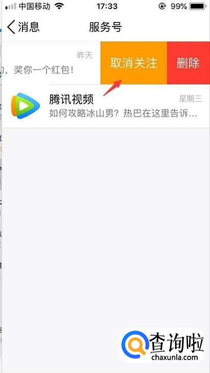 进入到服务号之后将不想接收消息的向左滑动,点击一下旁边的取消关注。