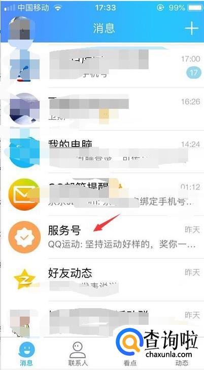 接着在qq的消息页面里找到服务号的消息入口,点击进去。