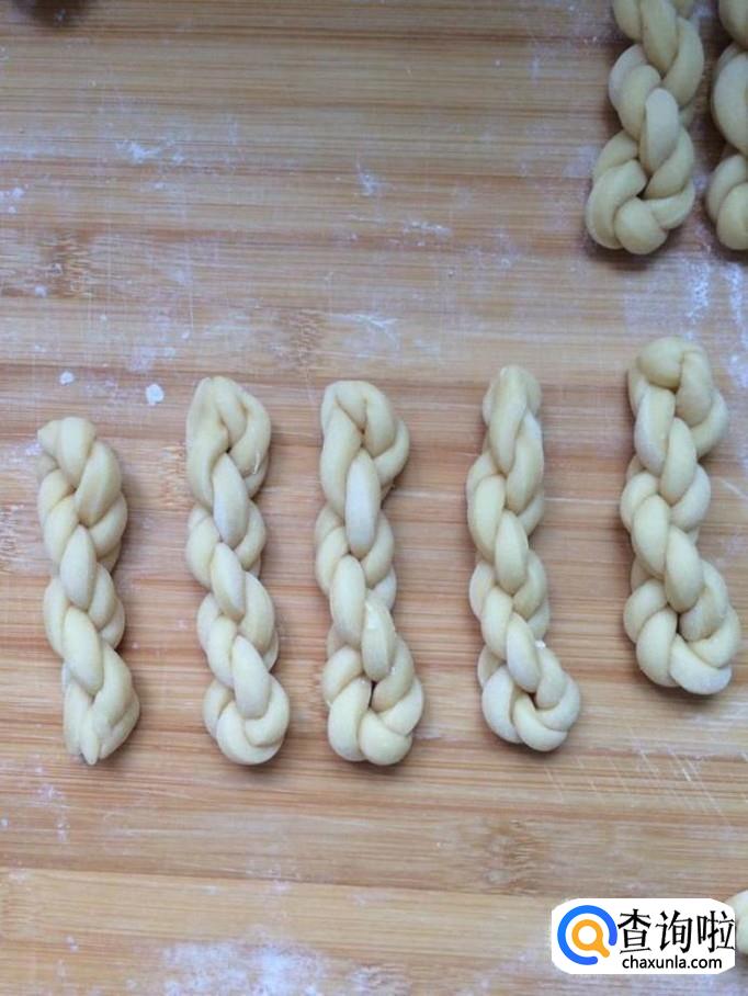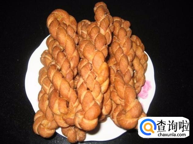 之后加入泡打粉和清水,然后搅拌面粉直至面粉成形。成形后将面团切成条,然后螺旋对折,做成麻花状。
