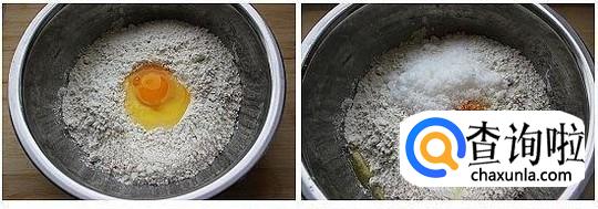 之后取面粉,把鸡蛋加入面粉中,再根据个人喜好加入适量的盐或者糖
