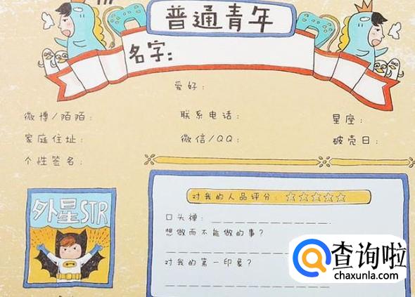 在同学录的以后页面,每一页记录一个同学的资料,比如:同学的名字、电话、QQ号、微信号、家庭住址、星座、生日、他的特点以及对自己的印象和评价,这样记,更具体,也更生动地记录每一个同学的情况。