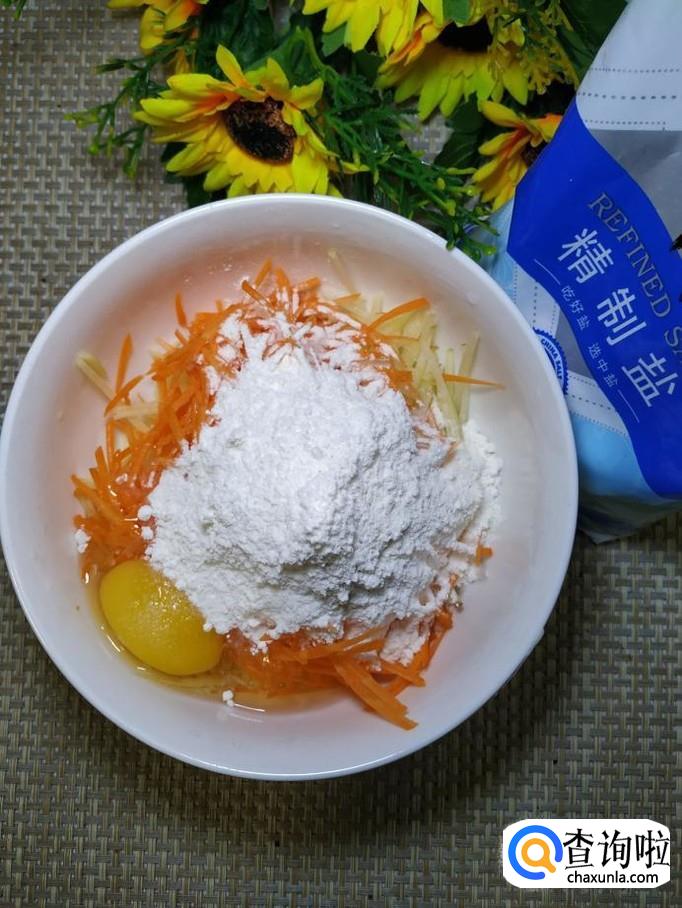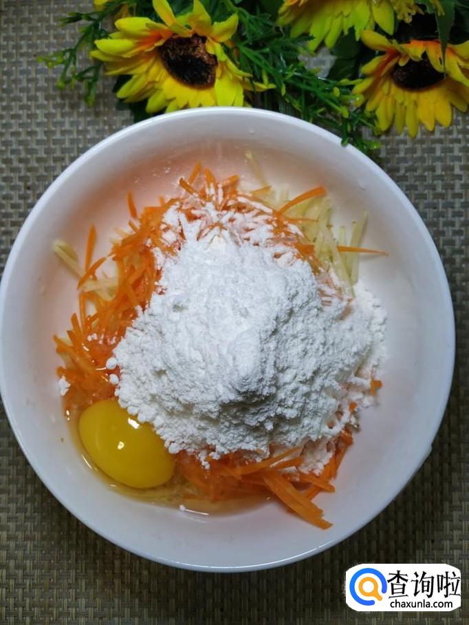加入适量面粉,面粉的量也不用太多,只要能够让土豆和胡萝卜丝有机的粘合在一起就可以了。