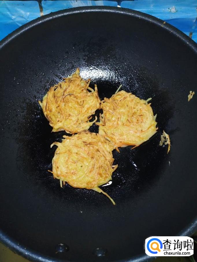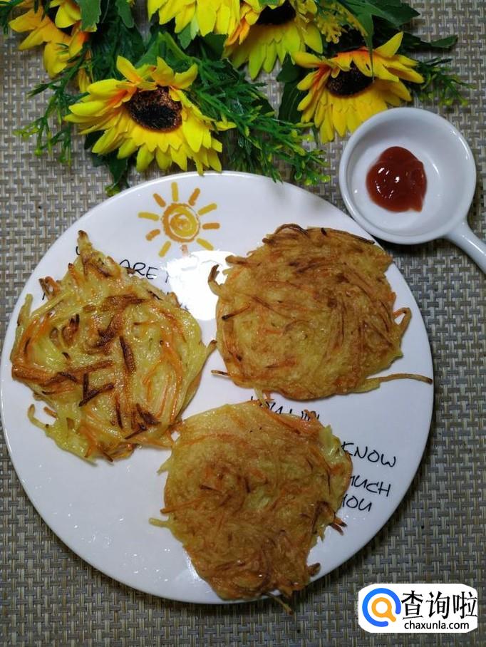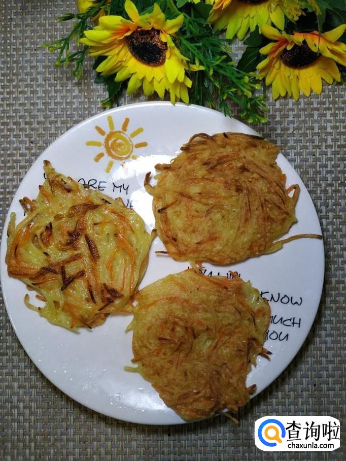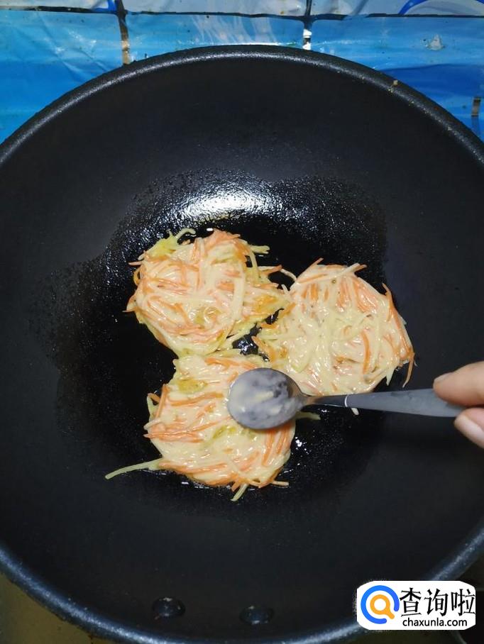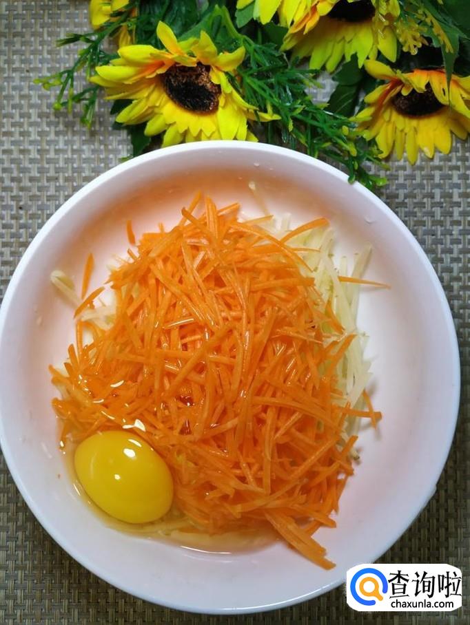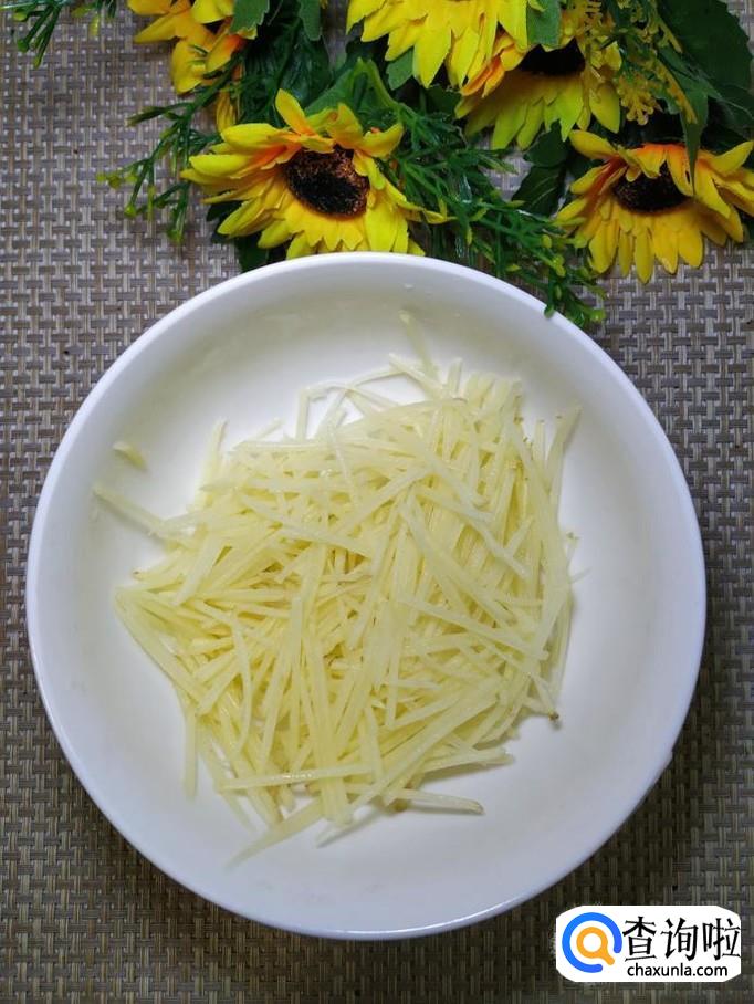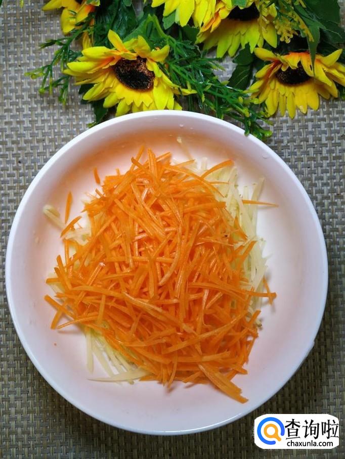 准备适量土豆和胡萝卜,将它们洗净后,先将土豆擦成丝,然后将胡萝卜也擦成丝,放在一起备用。小贴士:要擦成最细的丝,这样口感才好。