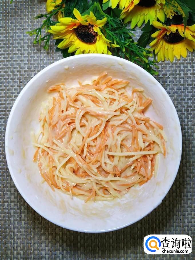 加入适量食盐,顺着一个方向搅拌,不用加水,放置一会儿,土豆丝和胡萝卜丝就会变软出水。